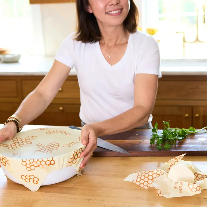 Beehive inspired and hand-drawn by our founder Sarah K, Bee’s Wrap® exclusive signature and beloved Honeycomb print, celebrates the hard-working bees that make our product possible! This is our best-selling pack size and best-selling print and a must-have for any reusable food storage or beeswax wrap set in your store. Our Assorted 3 Pack reusable, flexible, and durable wraps can be used to preserve leftovers, produce, cheeses, breads, and so much more! Each pack contains: 1 x Small Wrap (7″x 8″) 1 x Medium Wrap (10″ x 11″) 1 x Large Wrap (13″ x 14″) Handmade in Vermont using GOTS Certified Organic Cotton coated with a blend of sustainability-sourced beeswax, organic plant oils, and tree resin offering a washable, compostable, and reusable wrap that lasts for up to a year. Simply wash in cool water with a mild soap and let air dry, avoid exposure to heat. Compostable at the end of its usability, leaving without a trace. #Reusable, Sustainable, Compostable, Home, Kitchen